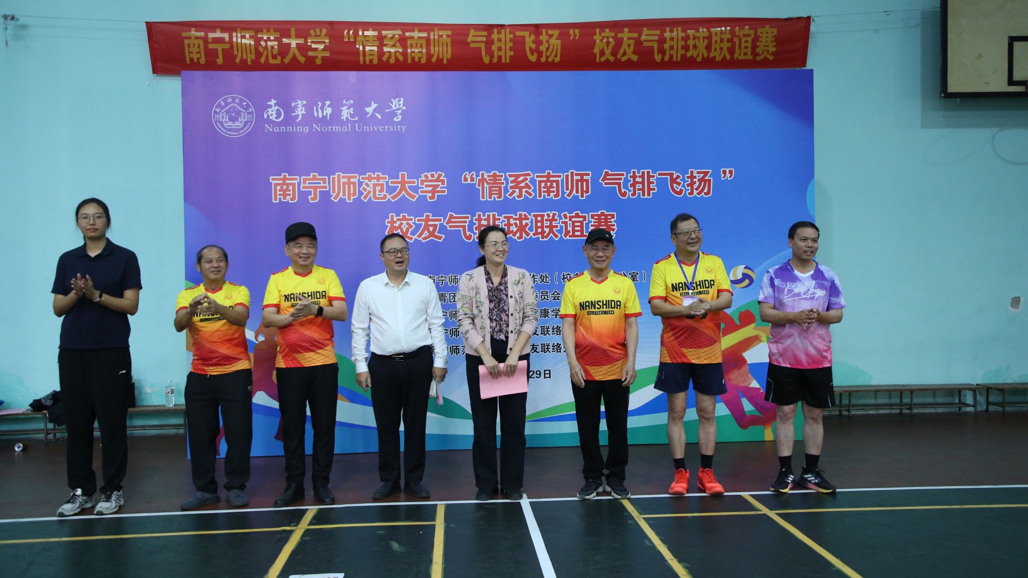 为进一步加强校友与母校的情感联结,搭建交流互动平台,营造和谐校园氛围,11月29日,由国内合作处(校友工作办公室)、校团委和体育与健康学院联合主办,南宁、崇左校友联络处承办的南宁师范大学“情系南师、气排飞扬”校友气排球联谊赛在明秀校区体育馆进行。本次比赛共有校友及教职工组成的9支队伍、53名选手参赛。